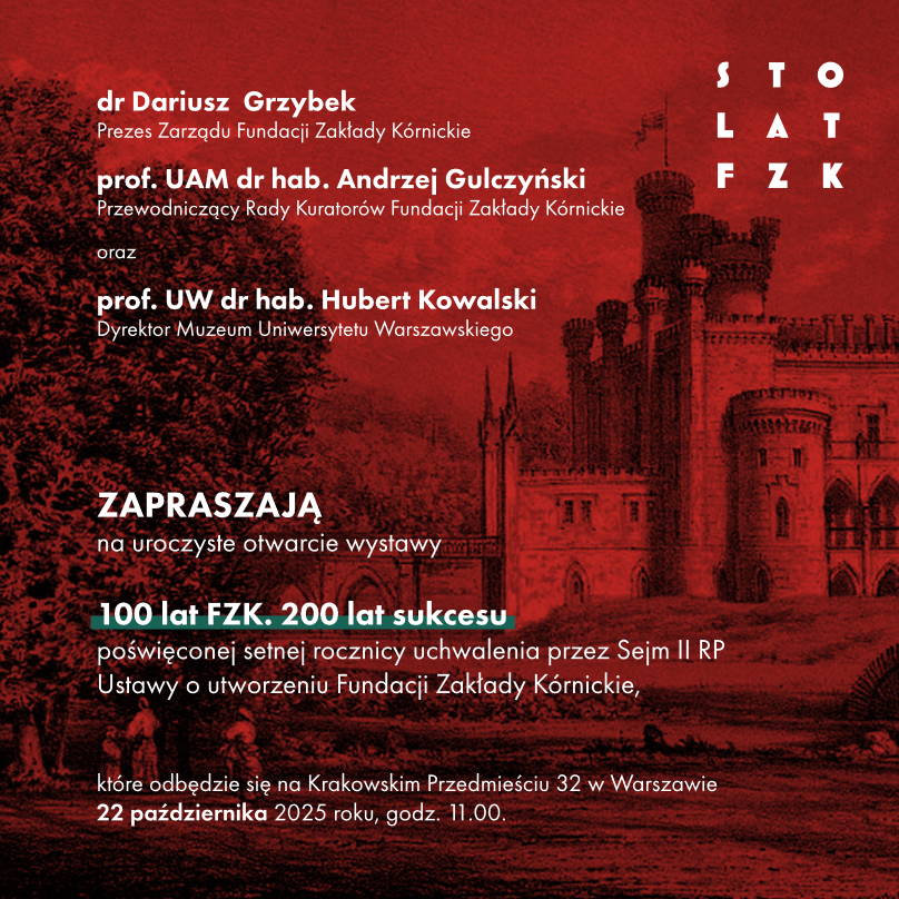 Wystawa przypomina niezwykłe dzieje Fundacji Zakłady Kórnickie – instytucji, która łączy w sobie romantyczny idealizm XIX wieku, pracę organiczną Wielkopolan i nowoczesne formy społecznego zaangażowania.